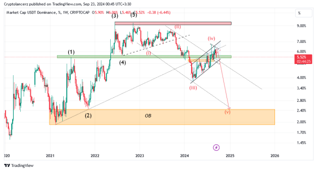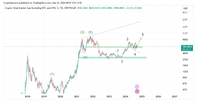 با اصول موج شماری و تعیین محدوده های حمایتی و مقاومتی مهم در چارت میتوان حرکت صعودی فعلی را در قالب 4 ریزموج لیبل زد که با خروج از کانال صعودی میتوان انتظار رشد آلت کوین ها را در قالب موج 5 داشت.