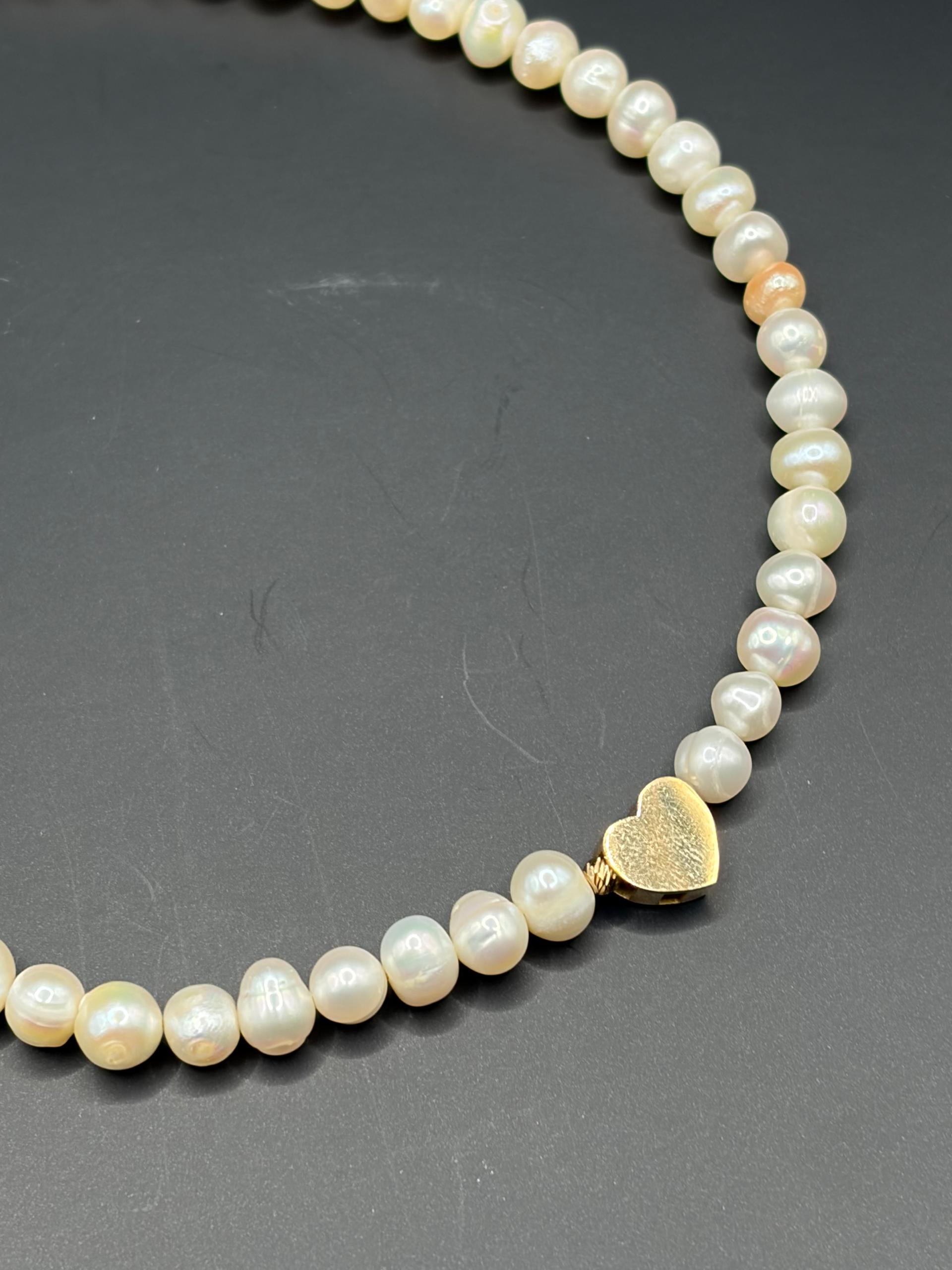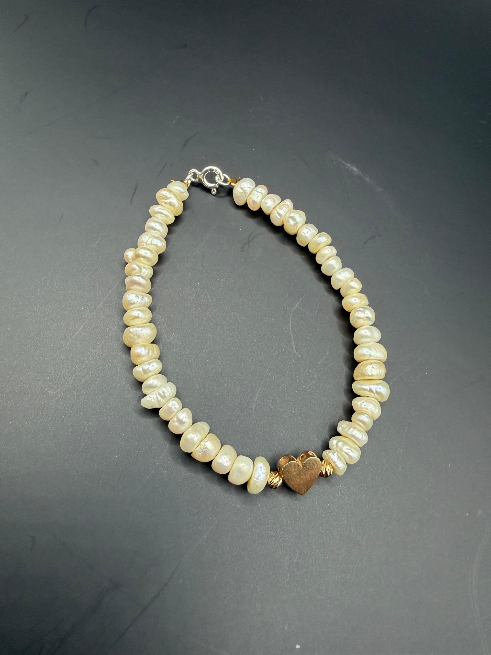 دستبند مروارید با پلاک قلب و گوی طلا