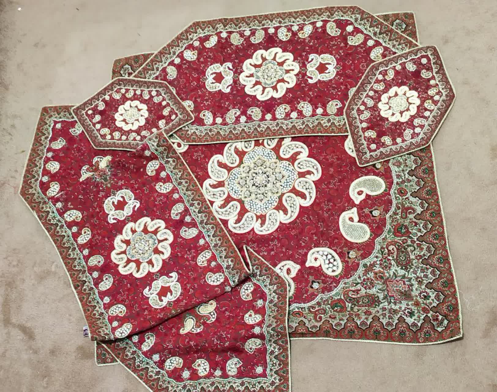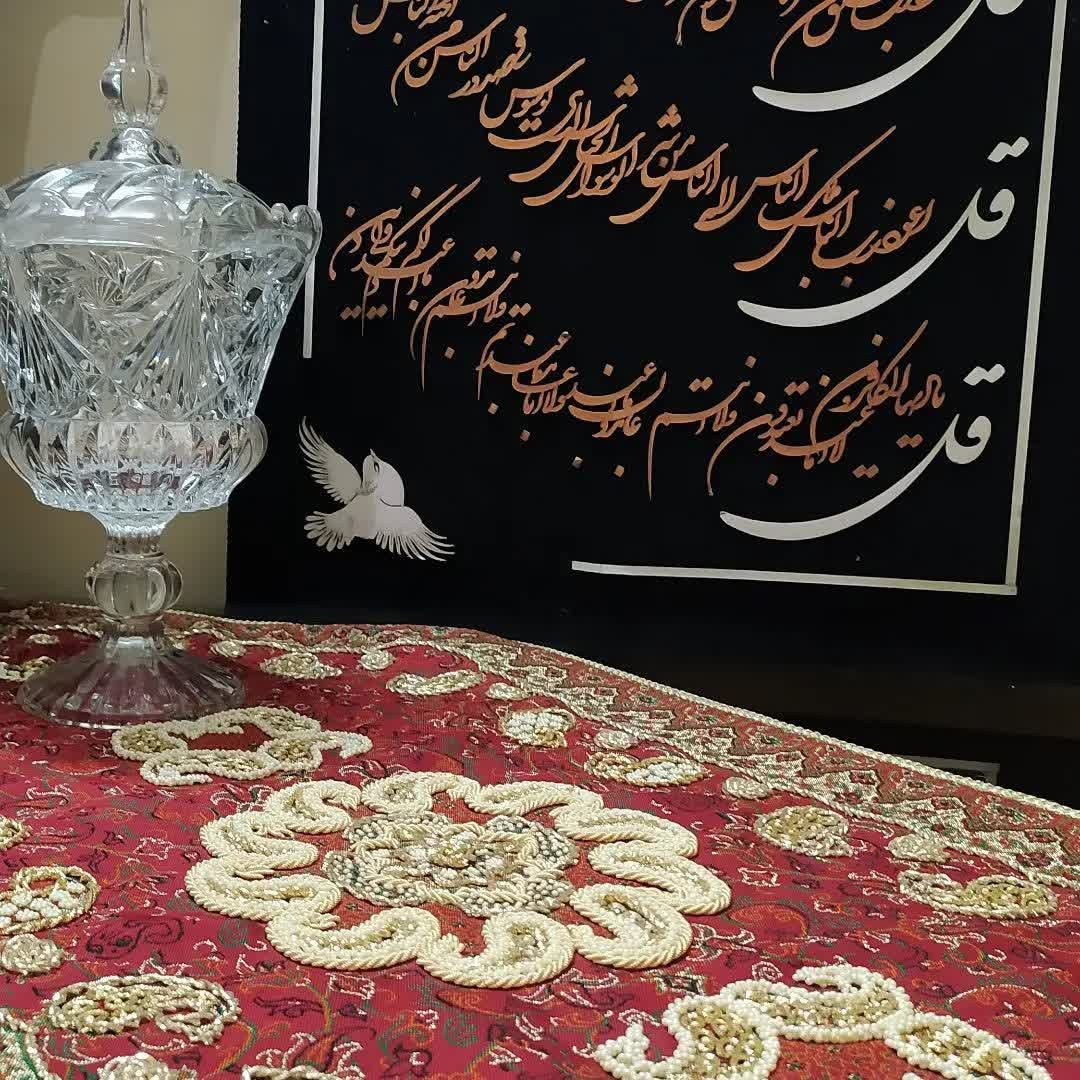 ست 5 تکه سرمه دوزی طرح ونوس روی ترمه برند رضایی تهیه شده از سرمه های صد در صد درجه یک و رنگ ثابت 5 تکه شامل: یک عدد بقچه ابعاد 1 در 1 یک عدد رانر ابعاد 1 متر و نیم در 47 سانت یک عدد رومیزی جلومبلی ابعاد 1متر در 47 سانت دو عدد عسلی ابعاد 26 در 44 سانت